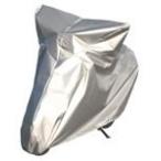 ケンレーン バイクカバーT01 Lサイズ 1,990mm〜2,150mm 素材:ポリエステル100%(軽量素材) 日本製 仕様:前後ゴム絞り式・センターロープ付 *完全防水ではありません。 カラー:シルバー ■カバーの前後は強力ゴムにより車体にしっかり固定して、強風によるカバーの外れを防ぎます。 Sサイズカバーは、自転車用(27インチまで)としても使えます。 ケンレーンのバイク用ボディカバーには、全種に強風でも飛ばされない工夫がされています。 センターロープ付前後ゴム絞り式や裾ロープ絞りなど、着脱の簡単さも考慮しています。 また、盗難防止ロック用リング付のタイプもご用意しております。