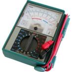 測定 ■直流電圧(DC.V):0.3/3/12/30/120/300/1200V ■交流電圧(AC.V):12/30/120/300/1200V ■直流電流(DC.mA):60μA/3mA/30mA/300mA ■抵抗(Ω):5KΩ/500KΩ/5MΩ ■1.5V電池測定:1.5VR20P/R14P/R6P Hiレンジ:1.5V250mA Loレンジ:1.5V50mA ■温度測定(℃):−50℃〜+250℃ 一般 ■精度:DC±3%、AC±4%、Ω±3%、温度±3%目盛長 ■1mドロッププルーフ: ホルスター付きで、コンクリート床上の1m落下に対してドロップ・プルーフ。 (注:非常に過酷な落下条件によっては、メーターバランスが狂うことがあります。 ) ■過負荷保護: ダイオードおよび0.3A 250Vヒューズにより×1と300mAレンジ保護 ■内蔵電池:1.5V R6P(単3) 1本 ■寸法:幅90×高さ136×厚さ30mm(本体のみ) ■重量:215g(本体のみ) ■付属品:ホルスター1個、テストリード1組、0.3A 250Vヒューズ1個、1.5V R6P電池1個(内蔵)、スペアヒューズ1本、スペア電池1個 |