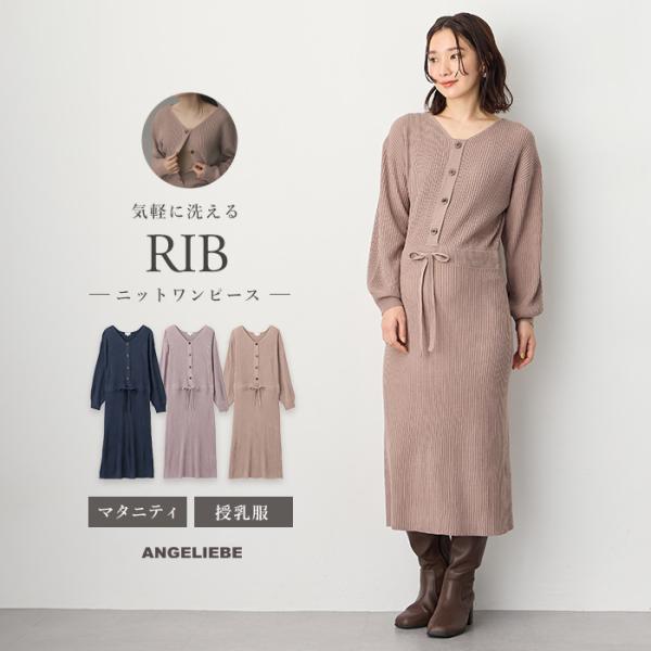 ANGELIEBE マタニティ ワンピース 冬 ロング 仕事 オフィス 秋冬 フロントボタン リブ ニット ワンピース 授乳服 授乳 キレイめ おしゃれ 可愛い 細見え