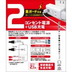「商品特長」 ■家庭用コンセントタップ(2個口)+USB充電ポート(2個口)付 ■コンセントを使いながら、スマートフォンや音楽プレーヤーを充電 ■USB充電ポートは高出力2.1A仕様。 急速充電可能。 ■雷サージ軽減部品内蔵。 落雷時に、接続している機器のダメージを軽減します。 ※雷サージ(誘電雷)とは、落雷によって生じる瞬間的な高圧電流のことです。 電源コンセントから伝わり接続機器にダメージを与えます。 ■製品ン仕様本体サイズ:W42XH80XD25mm(プラグ除く)・重量:約60g・定格入力:AC100V−240V/合計1400Wまで※本製品は直撃雷等を受けた場合、接続機器を保護できない場合があります。