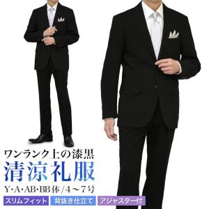 漆黒礼服ブラックサマーフォーマルスーツスリムノータックウエストアジャスター付清涼春夏メンズ冠婚葬祭濃染加工即日出荷テーラバック付属